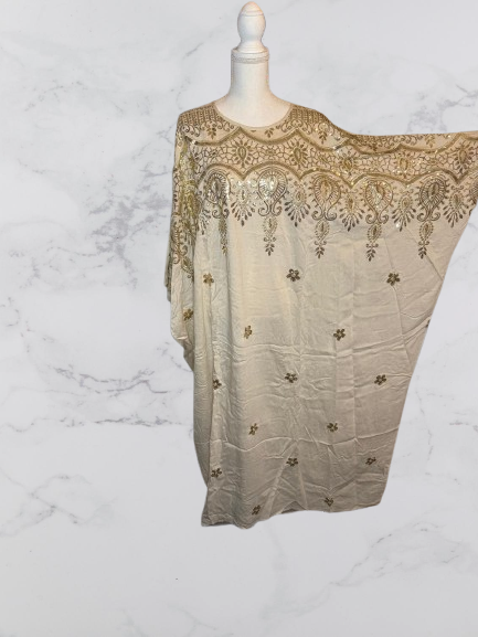 Son tissu fluide et ses somptueuses broderies dorées en font une pièce parfaite pour les grandes occasions.